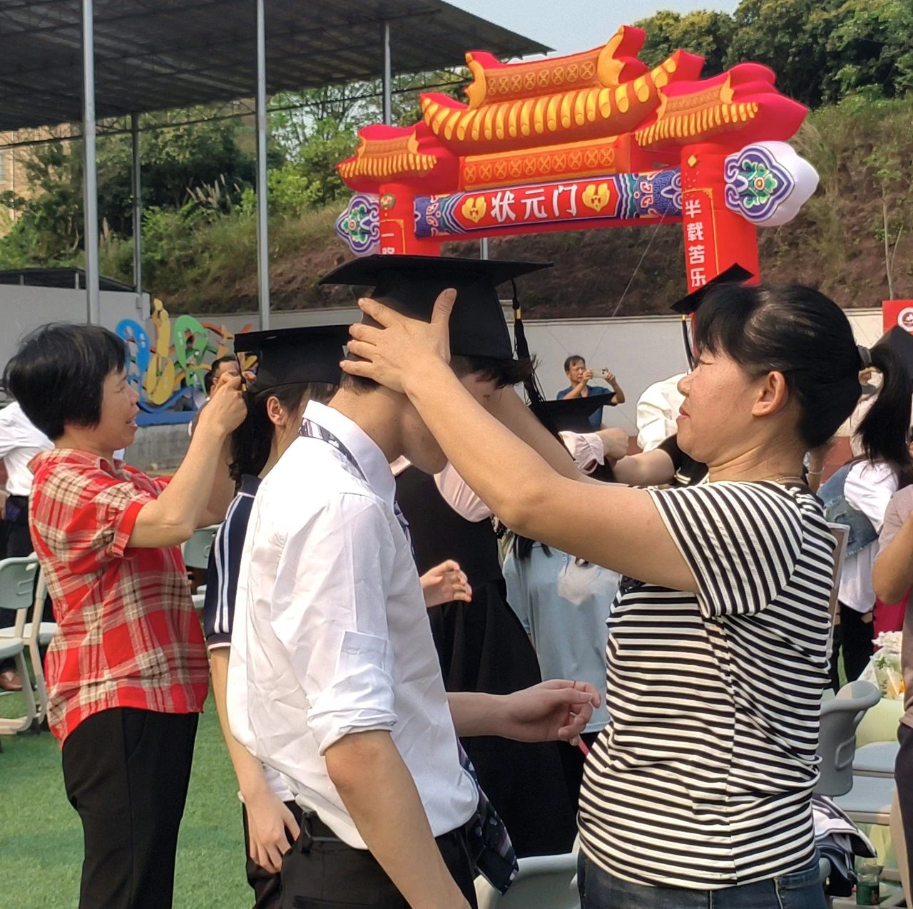 加冠礼,托期盼。戴上成人帽,不仅仅意味着年龄上的成人,心理上的成人,更重要的是精神、心智、思想上走向成熟,意味着从关注自我转向关心身边的父母、老师、同学、他人、社会。
