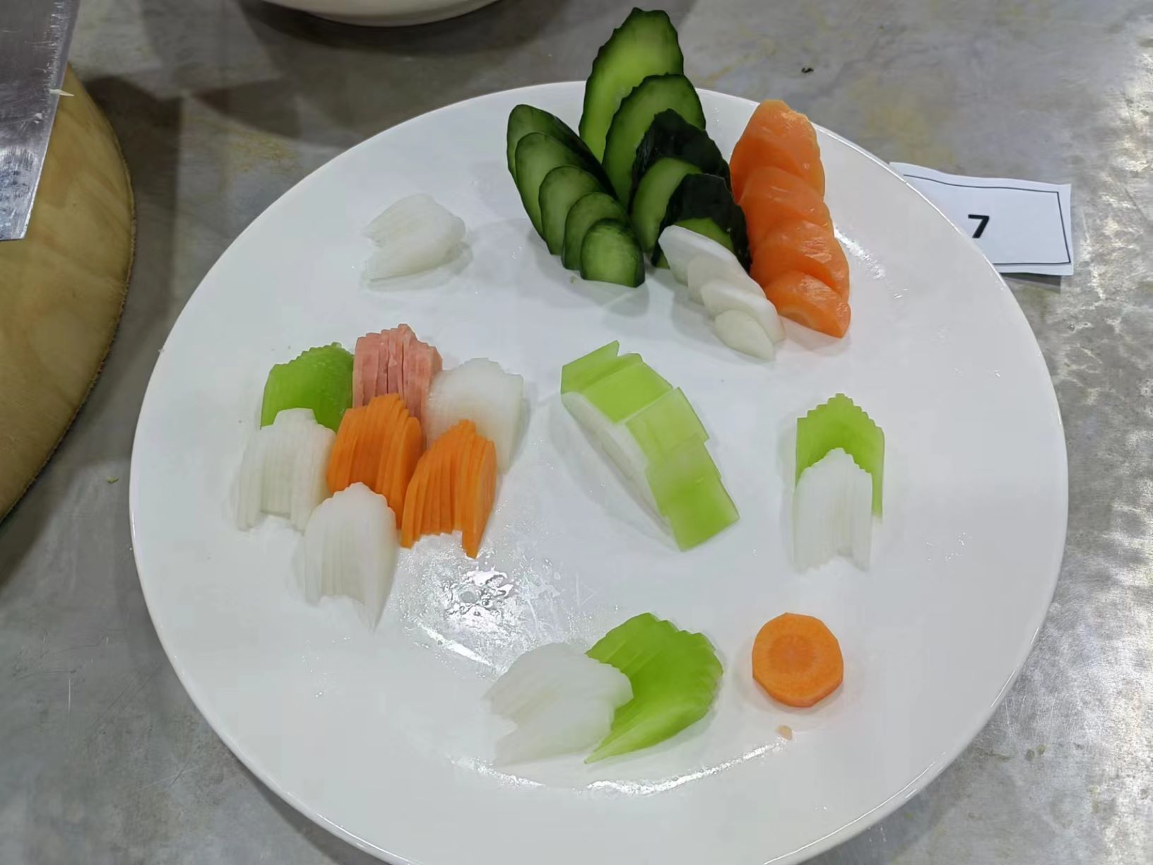 一年级竞赛的项目有:主题拼盘、剞切蓑衣花刀。这两大项目主要是考验选手们的刀工刀法、拼摆与形态、创意与实用、用料与卫生、成型规格、均匀度。